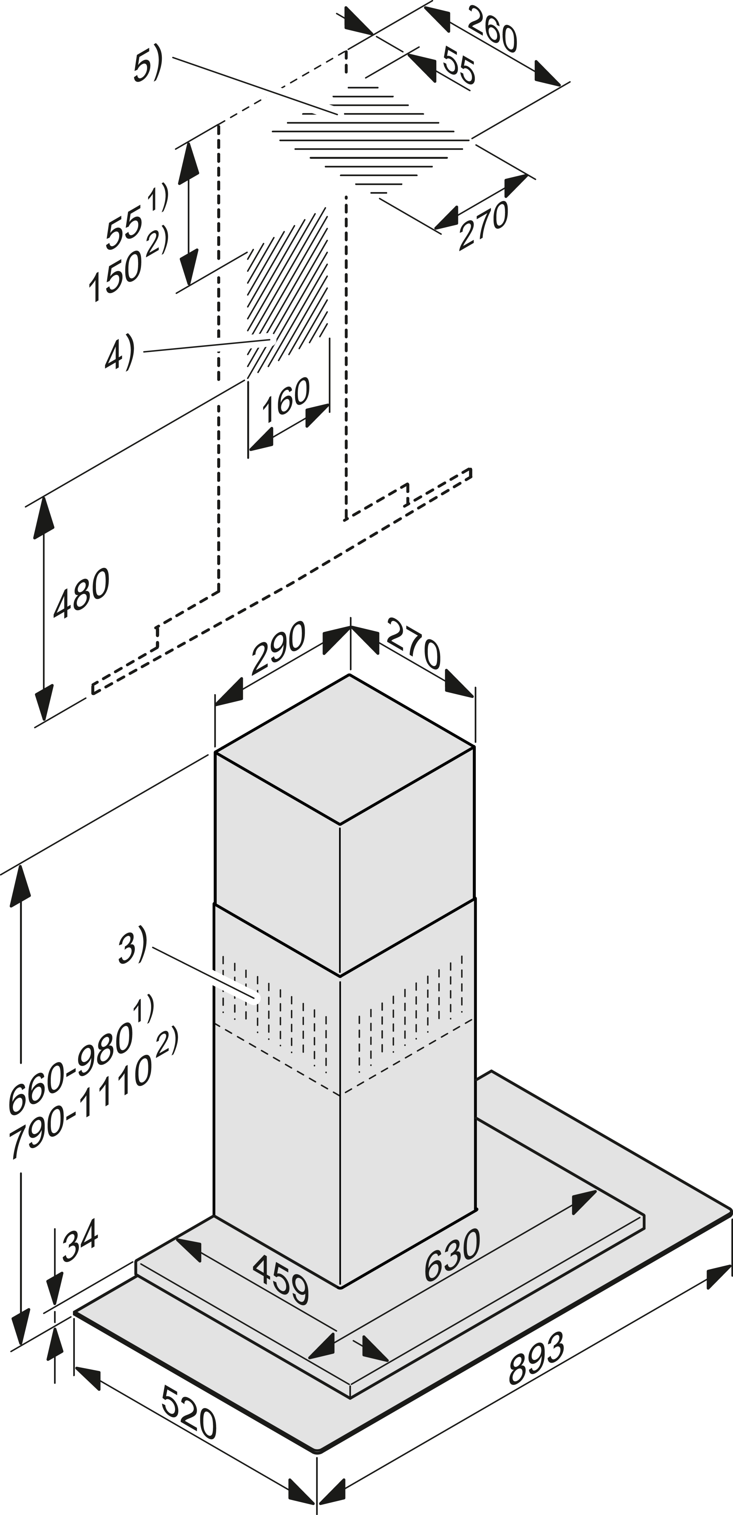 Дизайн – вытяжка из нержавеющей стали и стекла шириной 893 mm