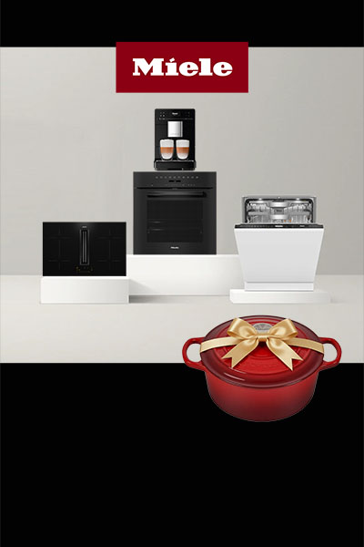 АКЦИЯ! При покупке четырех приборов Miele - духового шкафа, посудомоечной машины, кофемашины и варочной панели на сумму от 1 200 000 рублей - вы получаете одну из кастрюль Le Creuset в ПОДАРОК!